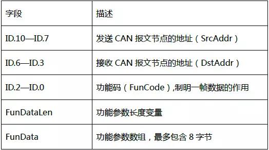 爲了給讀(dú)者演示CAN應用層協議(yì)的開發和使用(yong)方法,下面定義(yì)一個簡單的CAN應用協(xie)議棧,該協議棧(zhan)中隻用到CAN标準幀中(zhōng)的數據幀,幀ID中的11個位的(de)分配和使用方(fāng)法如下表所列(liè),協議中另外還(hái)定義了功能參(cān)數長度變量FunDataLen的功能(néng)參數數組FunData,該數組在(zài)需要時可以爲(wèi)某些特定功能(neng)函數提供足夠(gòu)的控制參數。
