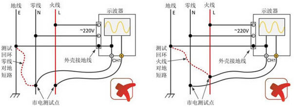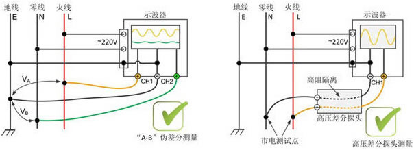 采用(yong)普通無源(yuán)探頭應用(yong)“A-B”法對市電(dian)進行測量(liang)時,應将兩(liǎng)通道探頭(tóu)的負端(地(dì))均接至電(dian)源地線,一(yi)個通道的(de)探頭探針(zhēn)(正端)接零(líng)線,另一個(gè)通道的探(tàn)頭探針(正(zheng)端)接火線(xiàn)(如圖5左所(suǒ)示),則兩通(tōng)道的測量(liàng)差值即爲(wèi)市電波形(xíng)。