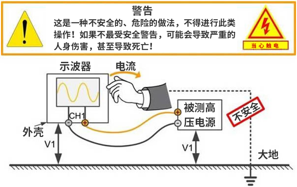 浮地測(ce)量時,示波(bo)器外殼金(jīn)屬端和探(tàn)頭接地端(duān)帶有同等(děng)電平。當測(cè)量市電時(shí),外殼可能(neng)帶有220V的電(diàn)壓,人體一(yī)旦接觸到(dào)示波器外(wai)殼,電流會(huì)經過人體(tǐ)流入大地(di),非常危🈲險(xiǎn)!