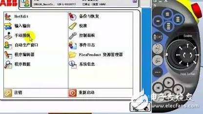 上圖是ABB機(ji)器人示教器,其(qi)中A是示教器與(yǔ)控制櫃之間的(de)連接電纜,B是觸(chu)摸屏,C是急停開(kai)關,D是手動操縱(zong)杆,E是數據備份(fèn)與恢複用USB接口(kou)(可插U盤/移動硬(yìng)盤等存儲設備(bèi)),F是使能按鈕。