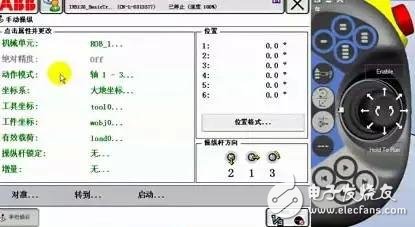 動作模式中,選(xuǎn)擇軸1-3。按下使能(néng)器到第一檔,手(shǒu)動操縱杆左右(yòu)方向可以控制(zhì)Axis1運動,上下方向(xiàng)控制Axis2運動,旋轉(zhuǎn)操縱杆控制Axis3運(yun)動。