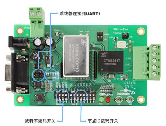 如圖(tú)所示,爲XGate-COP10評估闆(pan)。用戶可以通過(guo)RS232串口直接對模(mo)塊操作。CTM8251T爲緻遠(yuǎn)電子生産的帶(dai)2500VDC隔離的CAN收發器(qi)模塊。