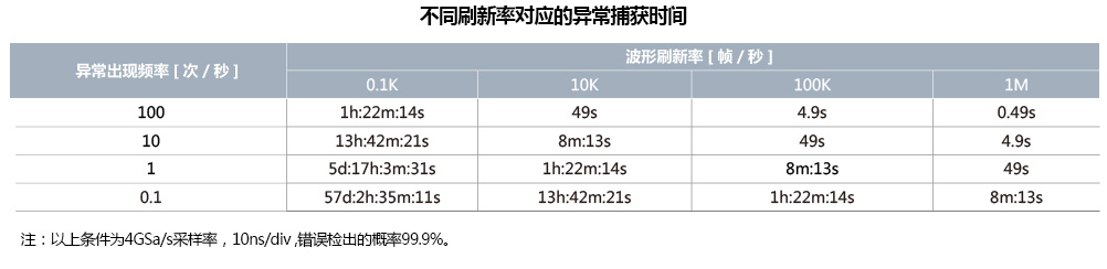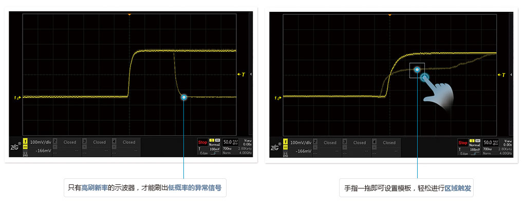 波(bo)形刷新率越高,死(sǐ)區時間就越短。ZDS4000系列示波(bō)器,标配業界最高(gao)的1M次波(bo)形刷新率,配合模(mo)闆觸發,讓您最大(da)概率的發現并💋捕(bǔ)獲👨❤️👨異常信号。