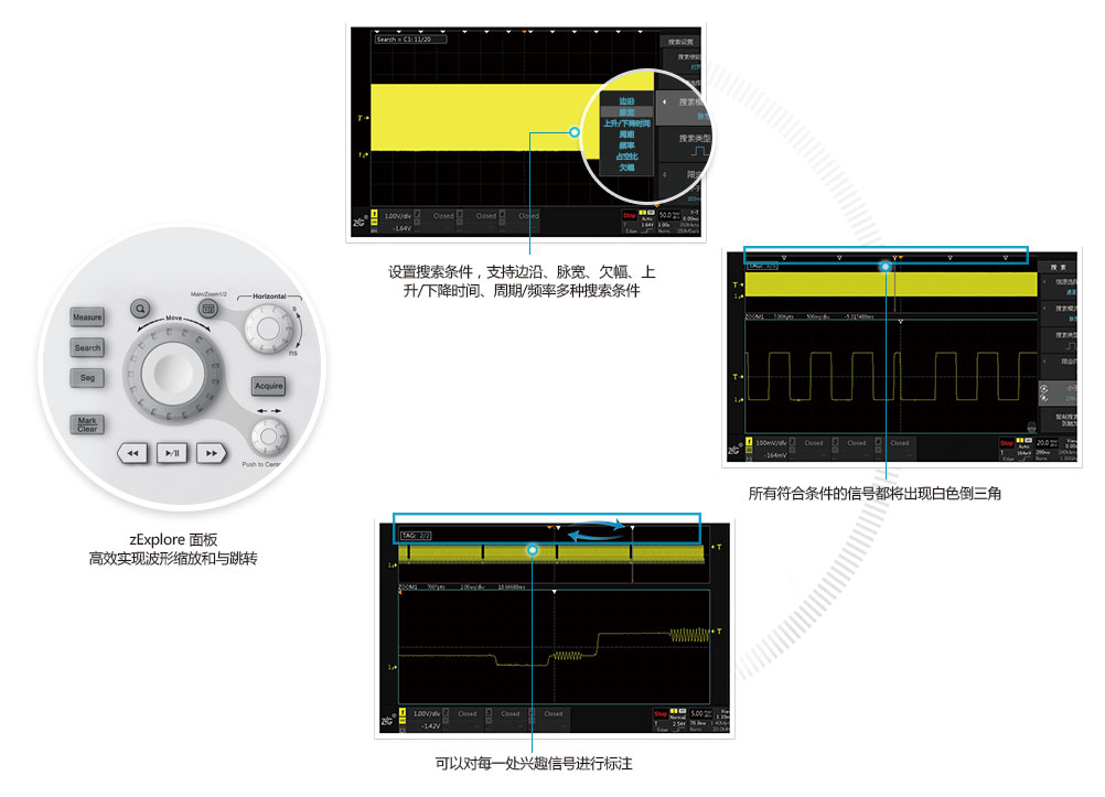 ZDS4000系列示波器不(bu)隻提供了512M的波形大數據(ju),還配有強大的波(bō)形搜索功能和智(zhi)能标注功能。您可(ke)以先通過邊沿、脈(mo)寬、欠幅、上升/下降時間、周(zhou)期/頻率(lǜ)等多種搜索條件(jiàn)來定位512Mpts波形數據中的異(yì)常點,再對找出的(de)異常信号使用标(biao)注功能,對異常信(xin)号進行标注。這裏(lǐ),所有的測量都是(shì)經過FPGA全(quán)硬件加速,整個過(guò)程1S左右(you)即可完成。再對找(zhǎo)出的異常信号使(shi)用标注功能,對異(yì)常信号進行标注(zhu)。