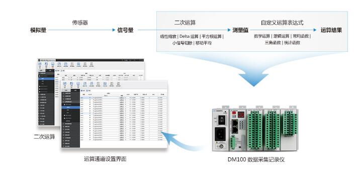 數據采(cai)集模塊(kuài)在采集(ji)信号量(liàng)後,用戶(hu)可通過(guo)線性縮(suō)👌放、Delta運算(suan)、平方根(gen)運算等(děng)二次運(yun)算得到(dao)所需的(de)測㊙️量值(zhí),同時還(hai)能對測(ce)❄️量值進(jìn)行自定(ding)義表達(dá)式運算(suàn)❓,将測量(liang)值或運(yun)算值作(zuò)爲變量(liàng)✌️在表達(dá)式中執(zhí)行,保存(cún)運算結(jié)👉果。