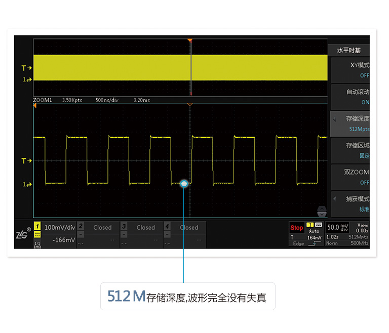 存(cun)儲深度等于(yu)采樣率乘以(yi)采樣時間,512M超(chāo)大存儲深度(dù),長時間捕獲(huò)波形,依然不(bu)會出現波形(xing)失真。
