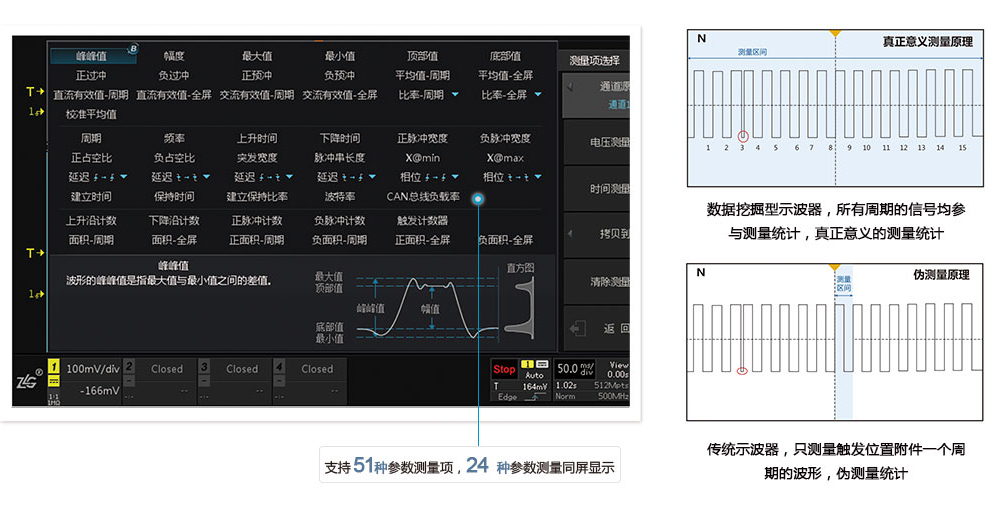 不同于傳(chuan)統示波器隻(zhī)測一個周期(qī),或通過抽樣(yàng)減少數據量(liàng)🐅再測量的模(mó)式,ZDS4000系列示波(bo)器通過FPGA全硬(ying)件♉并行處理(li),基于原始采(cai)樣🔞率和512Mpts全存(cun)儲深度,對每(měi)一幀波形✍️每(mei)一周期進行(hang)♉測量統計,僅(jin)需約1秒即可(kě)實現對512Mpts數據(jù)的“真正意義(yi)”參數測量,測(cè)試項目可達(da)51種,并且支持(chi)24種參數同時(shi)顯示。這與傳(chuán)統意義示波(bo)器🙇🏻的測量有(you)着本💯質的區(qū)别,也是示波(bō)器測試手段(duan)與☔測試方法(fǎ)的重大突破(po)。