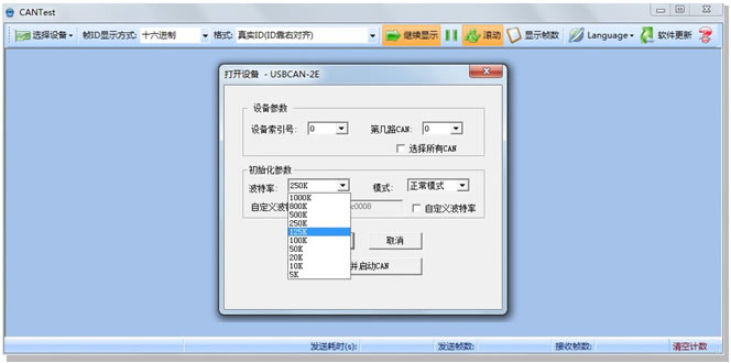 1.選擇(zé)設備波特(te)率、通道号(hao)、工作模式(shi)啓動CAN卡
