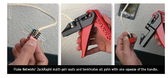 一(yi)旦插座連(lian)接正确,JackRapid 可(kě)允許您一(yī)次壓下扳(ban)手即可固(gù)定全部 8 條(tiáo)線纜。JackRapid 具有(yǒu)的内置刀(dao)片可切除(chú)固定在連(lian)接器中的(de)多餘線纜(lǎn),而無需另(ling)外切斷這(zhè)些線纜頭(tóu)。在 1000 個插座(zuo)的安裝中(zhōng),标準單線(xiàn)纜壓線器(qì)大概需要(yào) 29 工時,平均(jun1)工程成本(ben)約爲 1445 美元(yuan)。同樣的安(ān)裝工作,采(cai)用 JackRapid 隻需約(yue) 10 小時,平均(jun1)工程成本(běn)僅爲 500 美元(yuan)。與傳統的(de)單線纜壓(yā)線器相比(bi),JackRapid 可節省 2/3 的(de)安裝時間(jian)和成本。