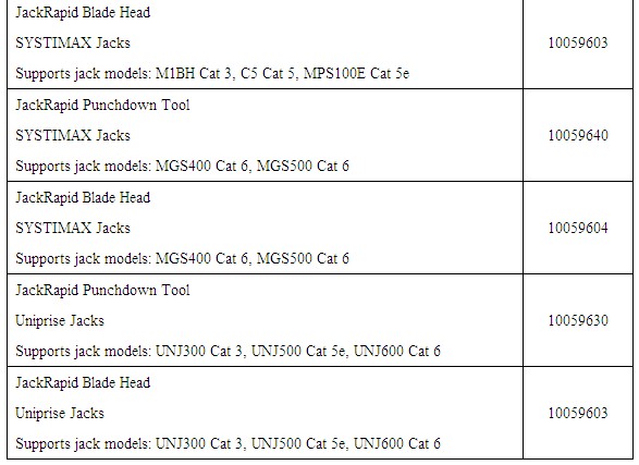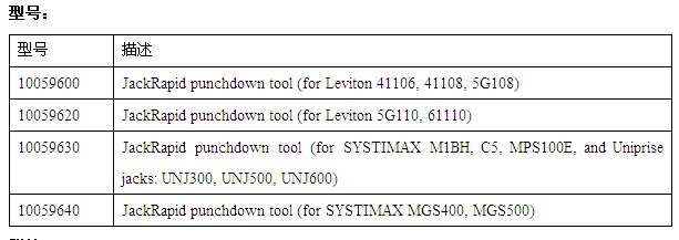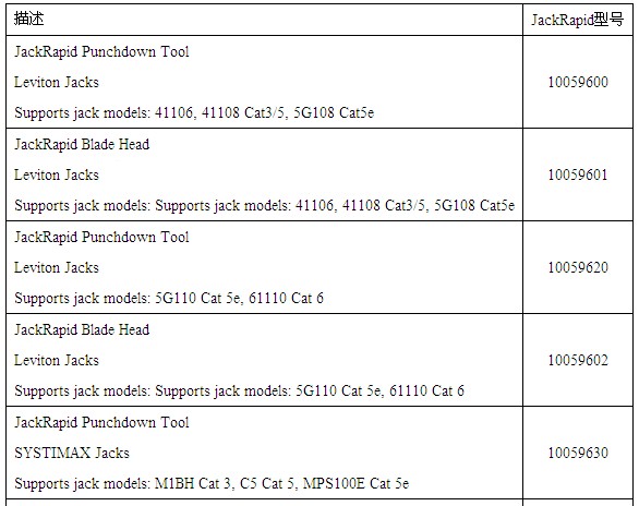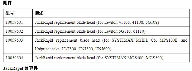 · JackRapid Systimax 和 Uniprise 刀(dao)片(紅色)支(zhi)持以下插(cha)座:Systimax:M1BH、C5、MPS100E 和 Uniprise:UNJ300、UNJ500 和 UNJ600