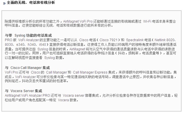 AirMagnet VoFI Analyzer 集(jí)成了來自 Cisco、Spectralink 和(he) Vocera 的先進語音(yin)解決方案,能(néng)夠收集和關(guān)㊙️聯由電🛀🏻話、無(wú)線和有線連(lián)接産生的診(zhěn)斷信息。通🌐過(guò)對✊這三種數(shù)據源進行分(fèn)析,AirMagnet 能夠提供(gong)綜合全面㊙️的(de)分析,讓網絡(luo)工作人員信(xin)心十足地部(bu)署和操作無(wú)線局域網語(yǔ)音通✌️信基礎(chǔ)設施。