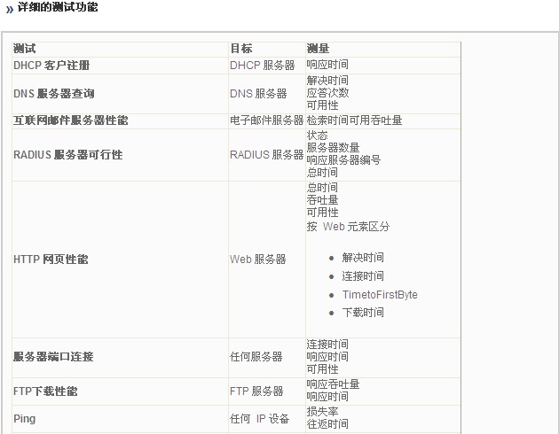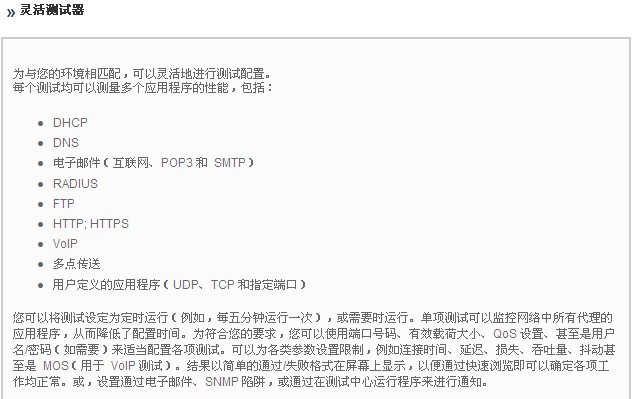 使用應用(yong)程序庫測量(liàng) 實際的應用(yòng)程序性能,包(bāo)括 HTTP、FTP、DNS、電子郵件(jian)、VoIP、ping 或使用靈活(huo)設置定義您(nin)的應用程序(xù)性能